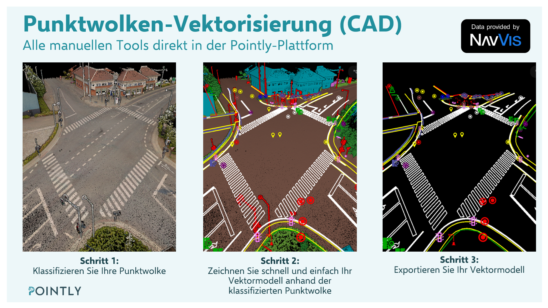 Pointly macht die Arbeit mit Punktwolken einfach und effizient, indem Klassifizierungs- und Vektorisierungsfunktionen mit KI-Technologie in einer nutzerfreundlichen, cloudbasierten Punktwolkenmanagement-Plattform kombiniert werden.